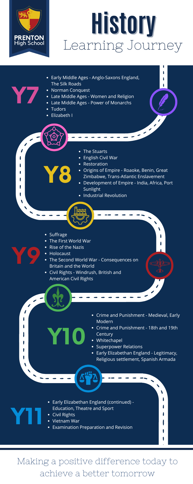 Our GCSE at Prenton offers students a wide range of skills that enhances their learning across the curriculum. Students will evolve their knowledge and skills from KS3 in order to develop into analytical thinkers with an academic writing style. We focus on British and American History over the past thousand years, charting the change and continuity that have impacted our diverse communities. Students’ passion for History is cultivated by the study of under-represented groups in historical narratives, for example Elizabeth I’s battle for legitimacy, witchcraft, Superpower nations and the struggle for Black American rights and treatment of civilians in the Vietnam War. History is a well-respected subject amongst many employers, sixth form colleges and universities and can lead to careers in law, politics, education, media and local government.