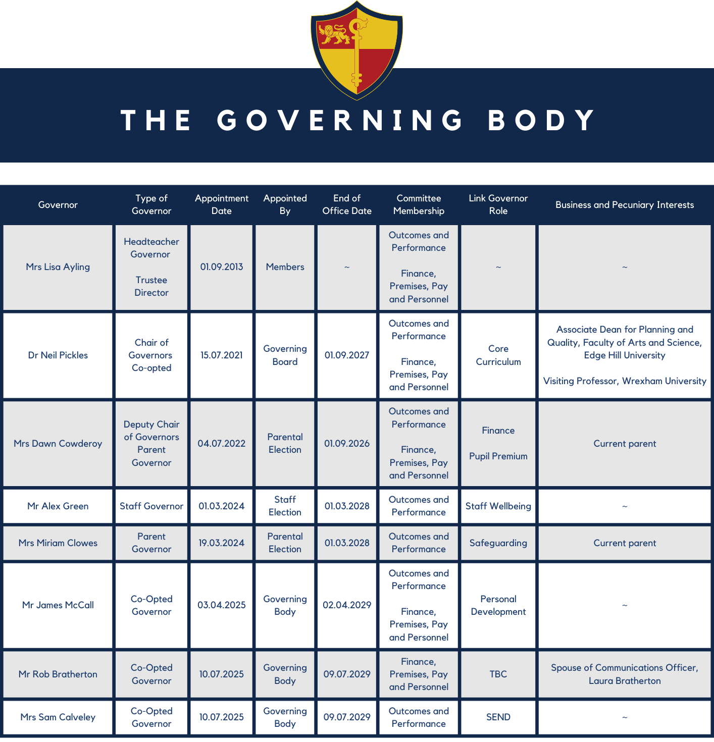 For those who wish to contact the Chair of the Governing Body, Dr. Neil Pickles, please speak to the school office or Mrs Cooper (PA to the Headteacher) for further details.
