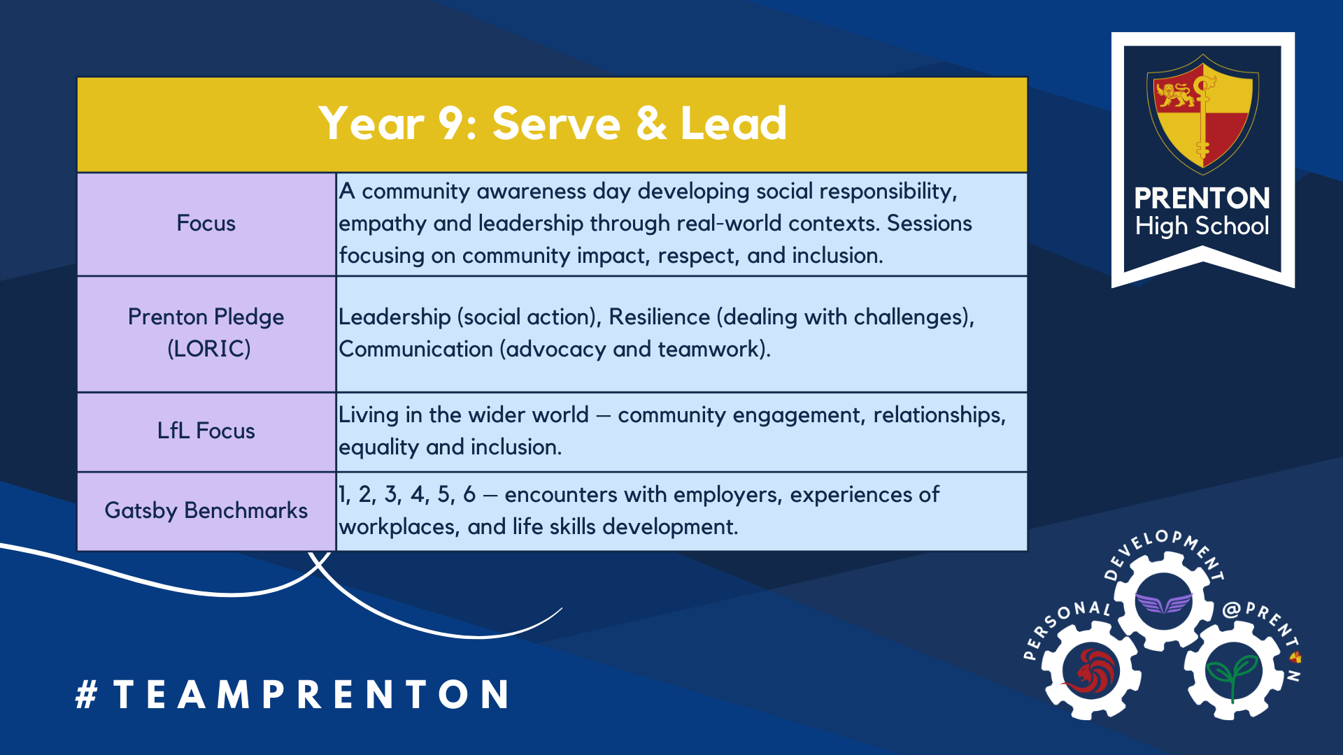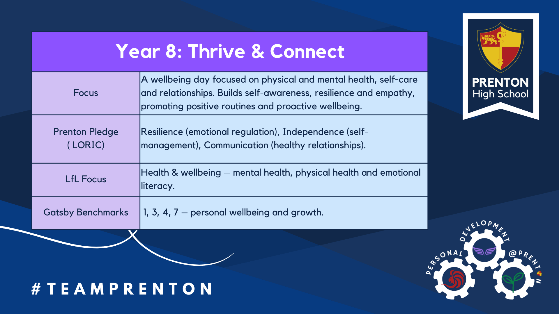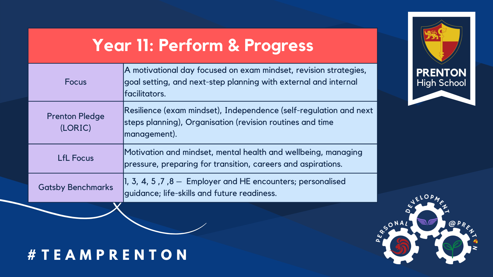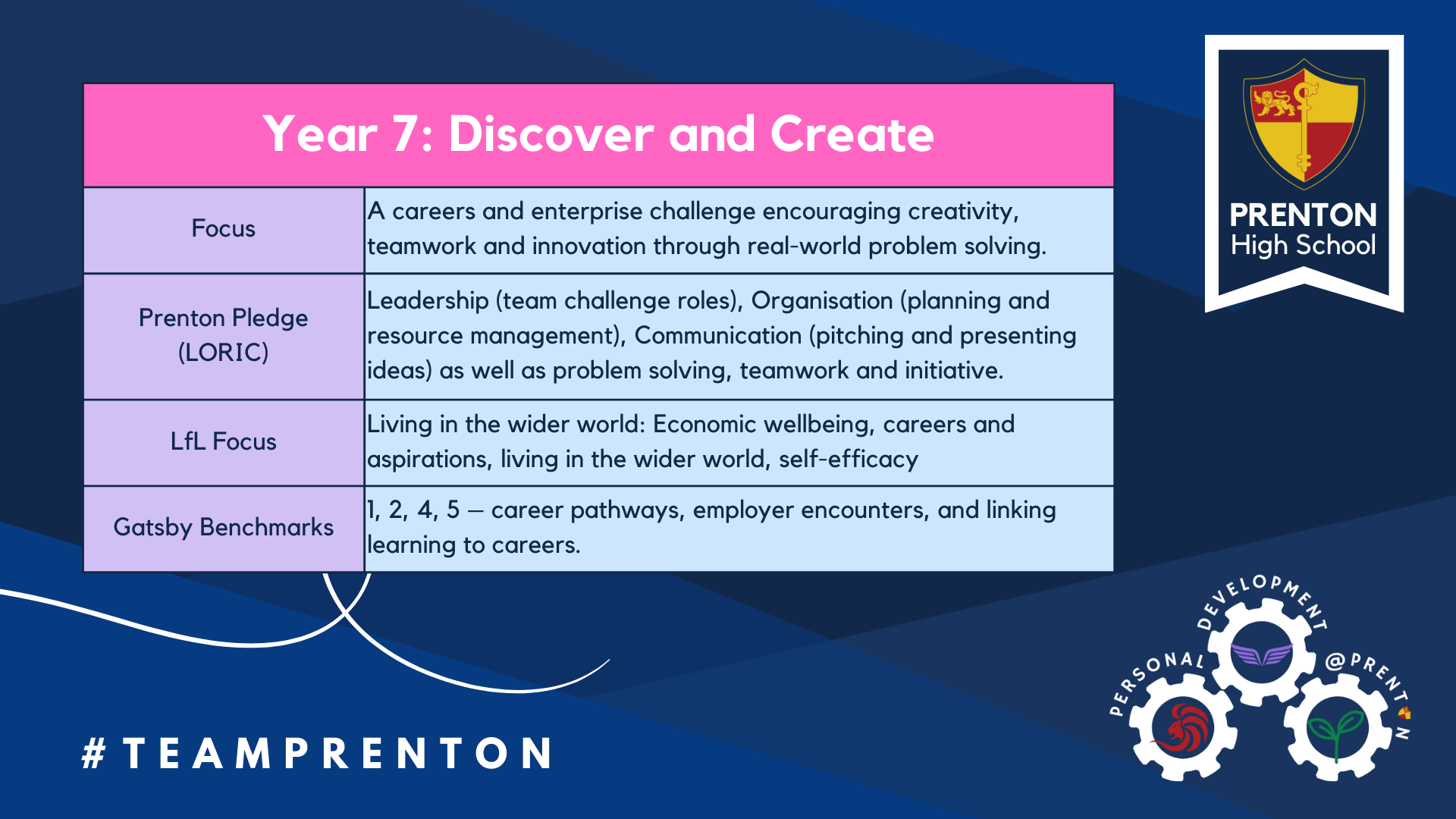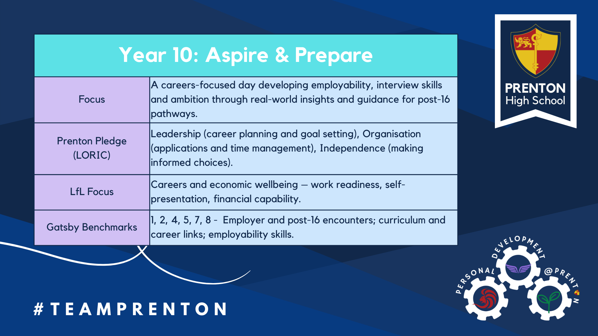 Each year group’s programme was aligned with the Prenton Pledge (LORIC), Learning for Life (LfL), and the Gatsby Benchmarks, ensuring a holistic approach to personal development, careers, and wellbeing.